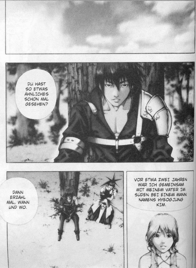 Als ich wieder mal in meinen Comic Laden nach brauchbarem Lesestoff stöberte, bin ich auf dieses Manhwa aus Korea gestoßen. Beim durchblättern ist mir die überdurchschnittliche Zeichnung sofort aufgefallen und mir wurde klar das ich zeichnerisch hier wohl einer der besten Comics aus Korea in den Händen hielt, die in Deutschland veröffentlicht wurden. Die Zeichnungen von Oh Se-Kwon fallen durch klare und durchgezogene Linien auf, selbst im Detail. Man merkt schnell, dass Oh Se-Kwon äußerst detailverliebt ist und simple Bilder in Karikatur-Stil, wie sie oft typisch sind, findet man selten. Trotz seines realistischen Zeichenstils geht die Dynamik nicht verloren. Besonders in den viel vorhanden Kämpfen, präsentiert uns Oh Se-Kwon eindrucksvoll sein Können. Zeichnerisch, behaupte ich mal, gehört dieses Manhwa zu der aller obersten Liga und kann sich sogar mit Mangas wie Vagabond aus Japan messen. Nun gut für die Augen wird einiges geboten, aber wie sieht es für den Geist aus? Oh Se-Kwon mag ein begnadeter Zeichner sein, aber ein grandioser Geschichtenerzähler ist er nicht. Das Comic hat Tempo und darauf zielt der Autor und Zeichner ab. Eine Geschichte ist quasi kaum vorhanden. Das dünne etwas was an Geschichte vorhanden ist, dient nur als Alibi um uns furiose Kämpfe zu liefern. Hierbei werden Aufrufe bzw. diverse Beschwörungen und Schwertsschläge die Felsen spalten ausgeteilt. Das ganze orientiert sich sehr an die große Gemeinde von Spielern der Fantasy-Rollenspiele im Stile von Final Fantasy. Wir haben also eine feudale Welt, die auch sehr den koreanischen Mittelalter nachempfunden ist, aber das ganze mit futuristischem Hightech kombiniert. Natürlich gibt es viele, nein Unmengen, von Mangas und Manhwas die, dieselbe Geschichte erzählen bzw. gar keine und den Leser nur furiose Kämpfe präsentieren wollen und meistens meide ich diese Comics, weil für mich das wichtigste doch noch immer die Geschichte ist. Ich muss aber zugeben das „Chronik eines Kriegers“ unheimlich viel Spass macht. Oh Se-Kwon begeht nicht den Fehler ins unsinnige oder alberne ab zu schweifen, dass passiert eher selten. Also eine koreanische „Dragon Ball“ Version sollte man hier nicht erwarten. Das ganze ist höchstens vom Stil her mit den Erfolgs-Manga „Dark Angel“ von Kia Asamiya zu vergleichen, wobei Oh Se-Kwon zeichnerisch auch dieses übertrifft, aber die Geschichte bei „Dark Angel“ ist natürlich dafür um einiges komplexer und interessanter und somit auch das bessere Comic. Trotz alle dem ist das Comic sein Geld wert. Es unterhält einen vorzüglich und dürfte vielen Fantasy Liebhabern des Genres zu sagen. Das Manhwa bietet einen eine unverfängliche und kurzweilige Unterhaltung, die aber einen auch nicht wirklich lange in Erinnerung bleibt.